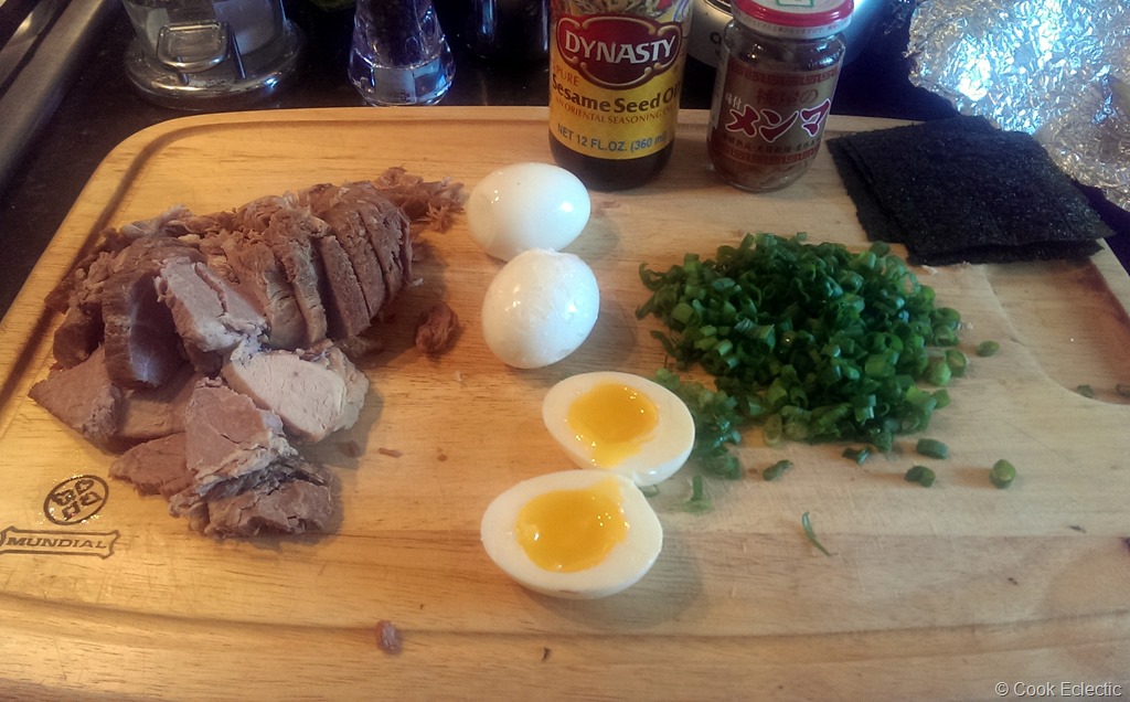 6. While waiting for the water to boil, peel the cooled eggs and slice in half lengthwise, slice your scallions, and prepare the other garnishes.